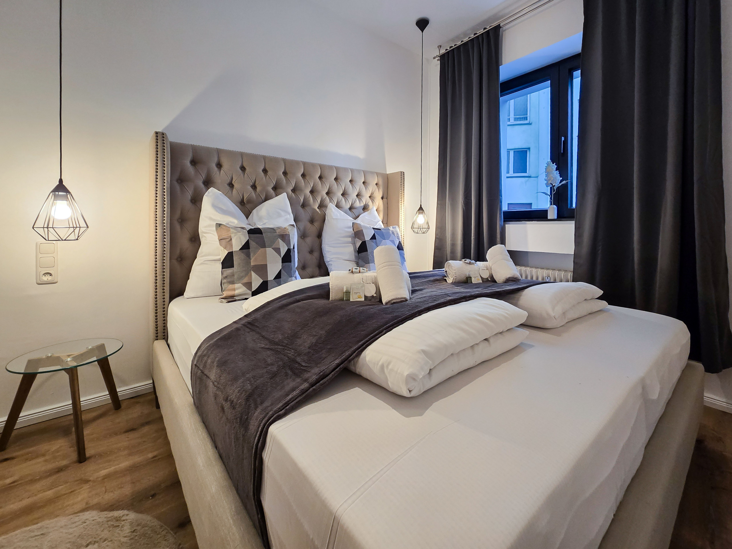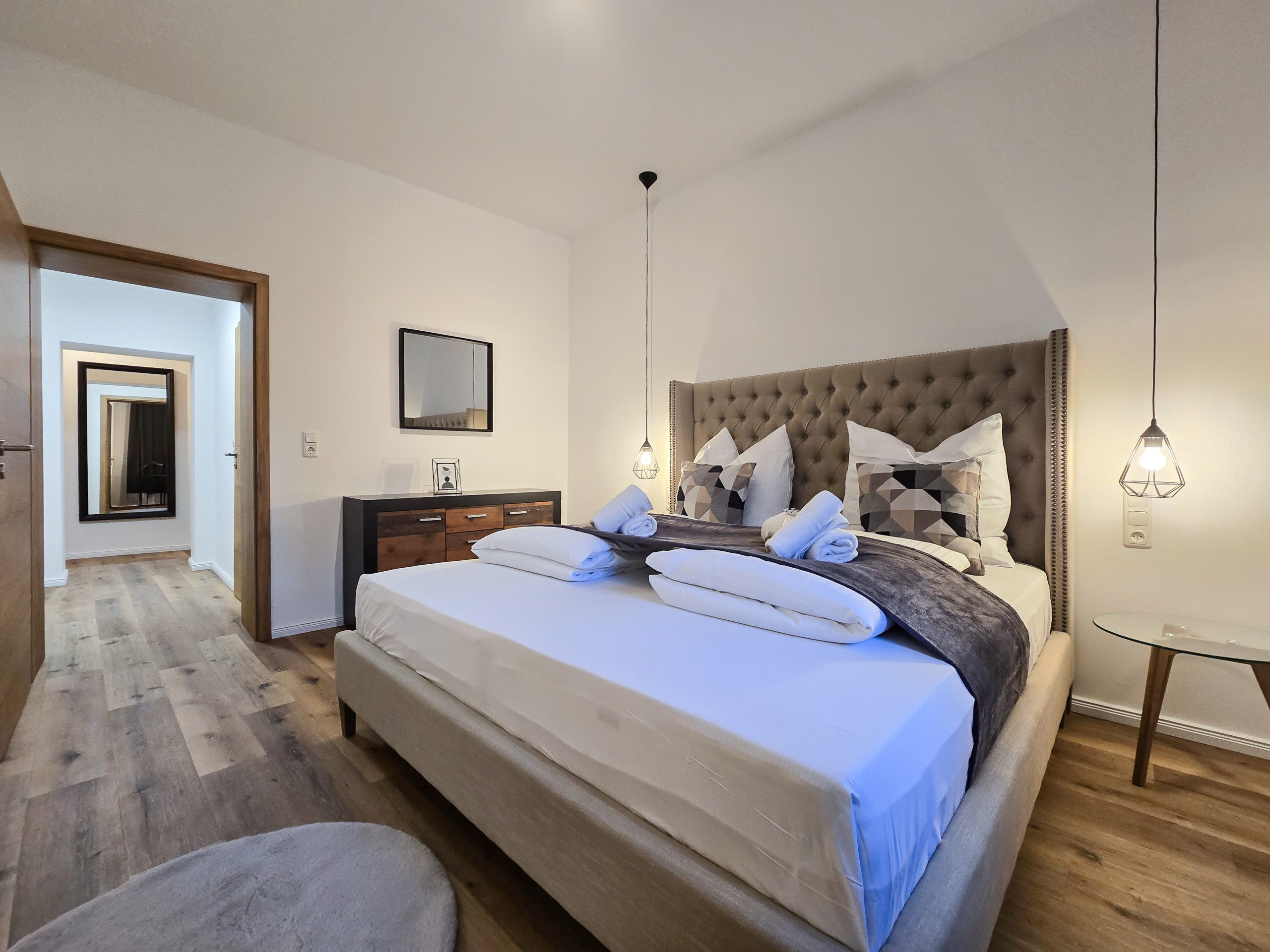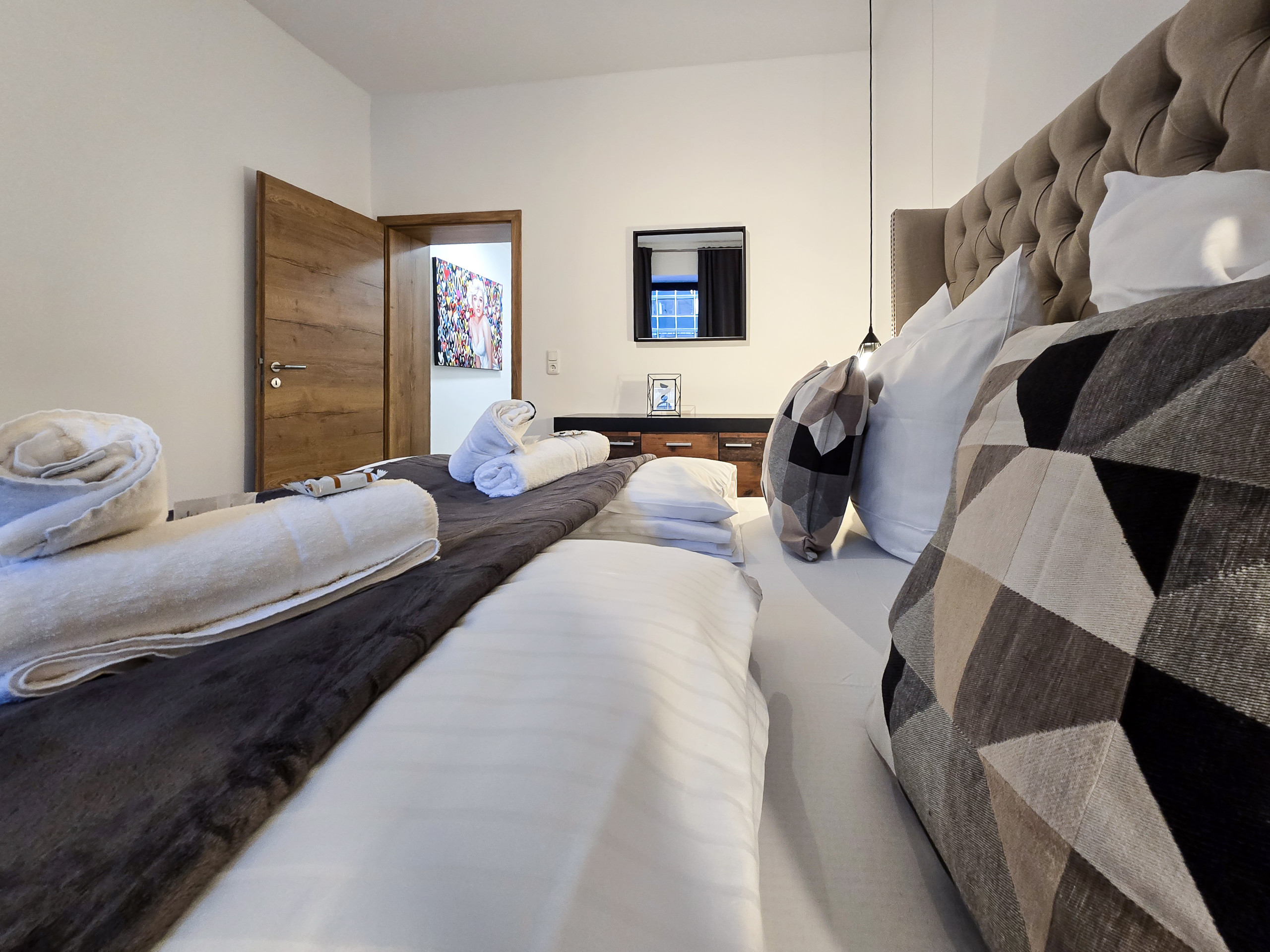 Auf großzügigen 70 m² entfaltet sich eine moderne und stilvolle Wohlfühlatmosphäre. Die Unterkunft befindet sich in der 3. Etage – dank des Aufzugs mühelos erreichbar. Das klare, durchdachte Design schafft einen ruhigen Rückzugsort nach einem ereignisreichen Tag. Hier finden Sie den idealen Raum, um gemeinsam Zeit zu verbringen oder sich in eines der drei Schlafzimmer für eine private Auszeit zurückzuziehen.