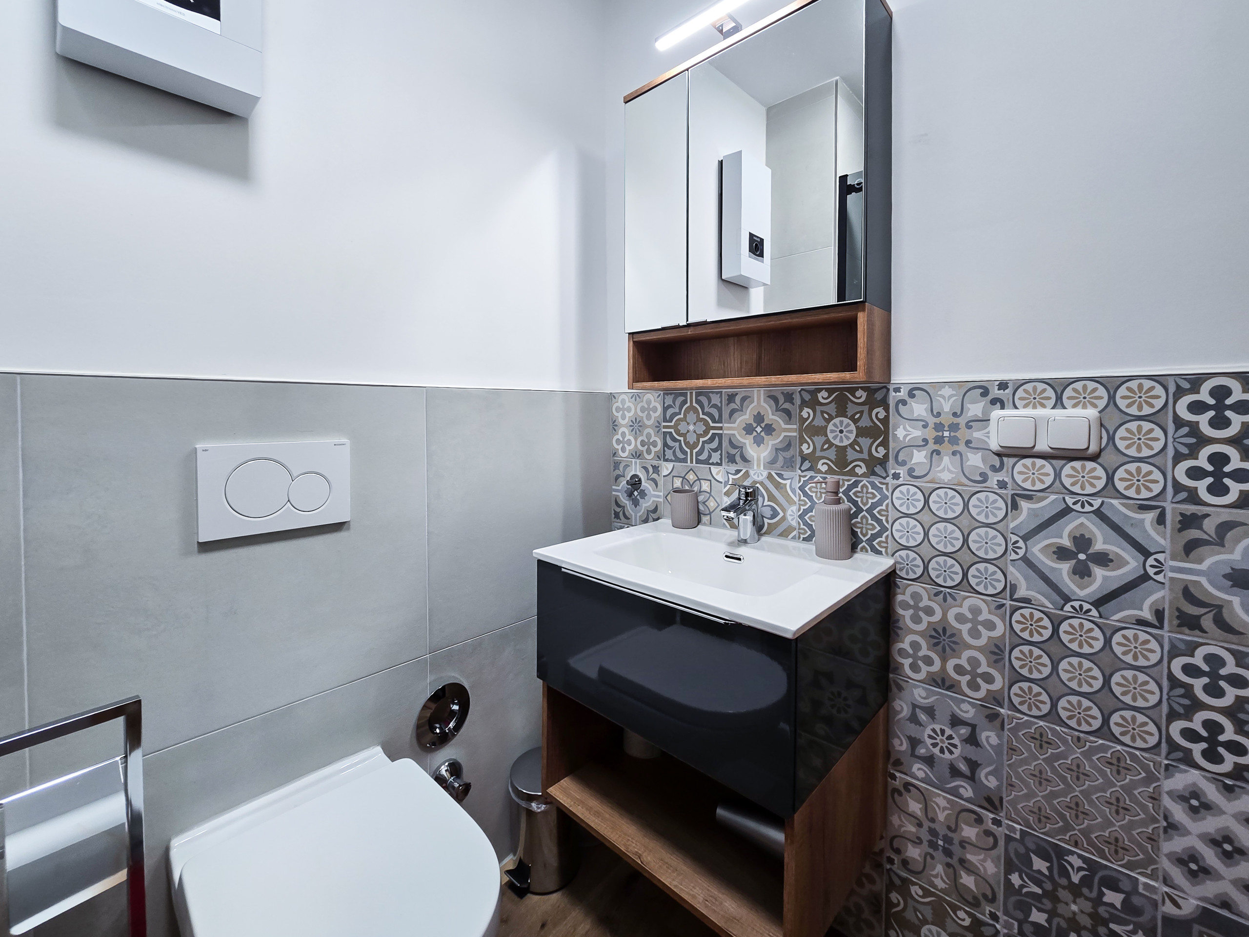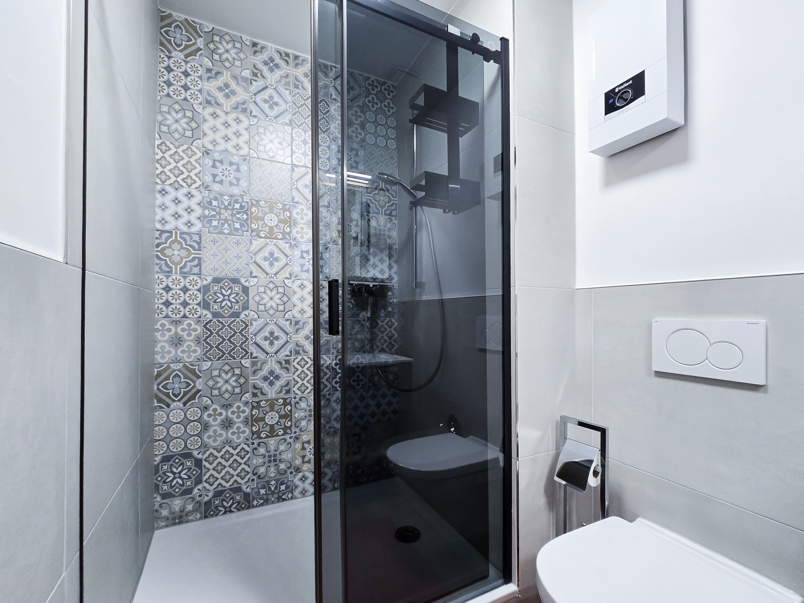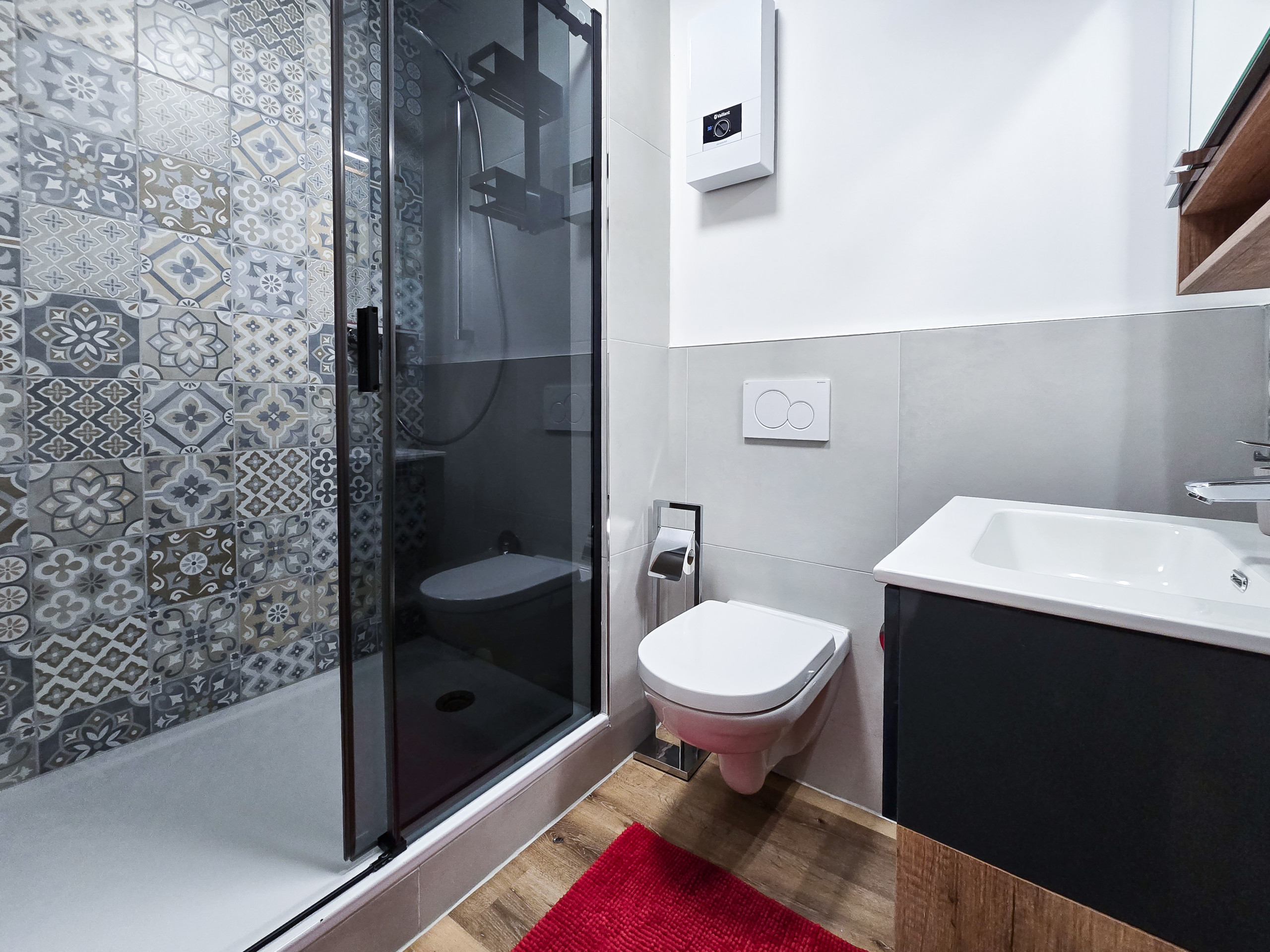 - Bad: Starten Sie den Tag im modernen Badezimmer, das mit einer erfrischenden Dusche ausgestattet ist.